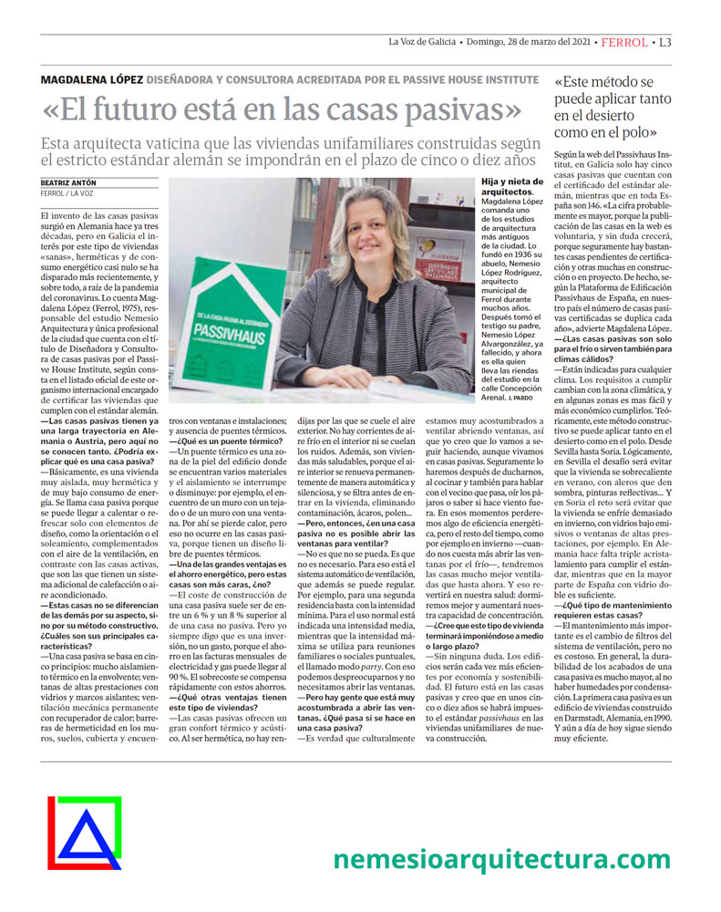 El pasado 28 de marzo nos entrevistaron en La Voz de Galicia para hablar del Passivhaus. Nos eligieron por ser el estudio de arquitectura pionero y el único en Ferrol con la formación y certificación requerida por el Passivhaus Institut para el diseño de construcciones pasivas y el servicio de consultoría..
